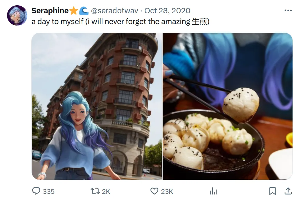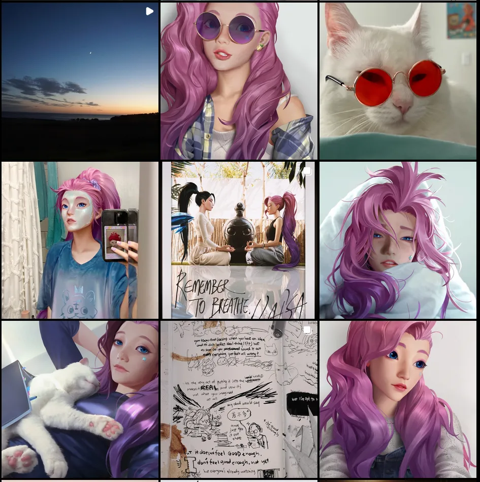 Les comptes Twitter et Instagram de Seraphine furent créés en juin 2020. Y sont postés depuis des photos de sa « jeunesse » fictive, de son chat (en image de synthèse), des bouts de son carnet personnel, des tweets d’humeur, etc. Ne citant pas sa filiation à la licence LoL, nous rentrons dans l’intimité de ce personnage qui nous présente sa vie, ses relations avec ses amies ainsi que son parcours artistique dans le groupe de musique K-pop K/DA avec quatre autres personnages de l’univers League Of Legend.