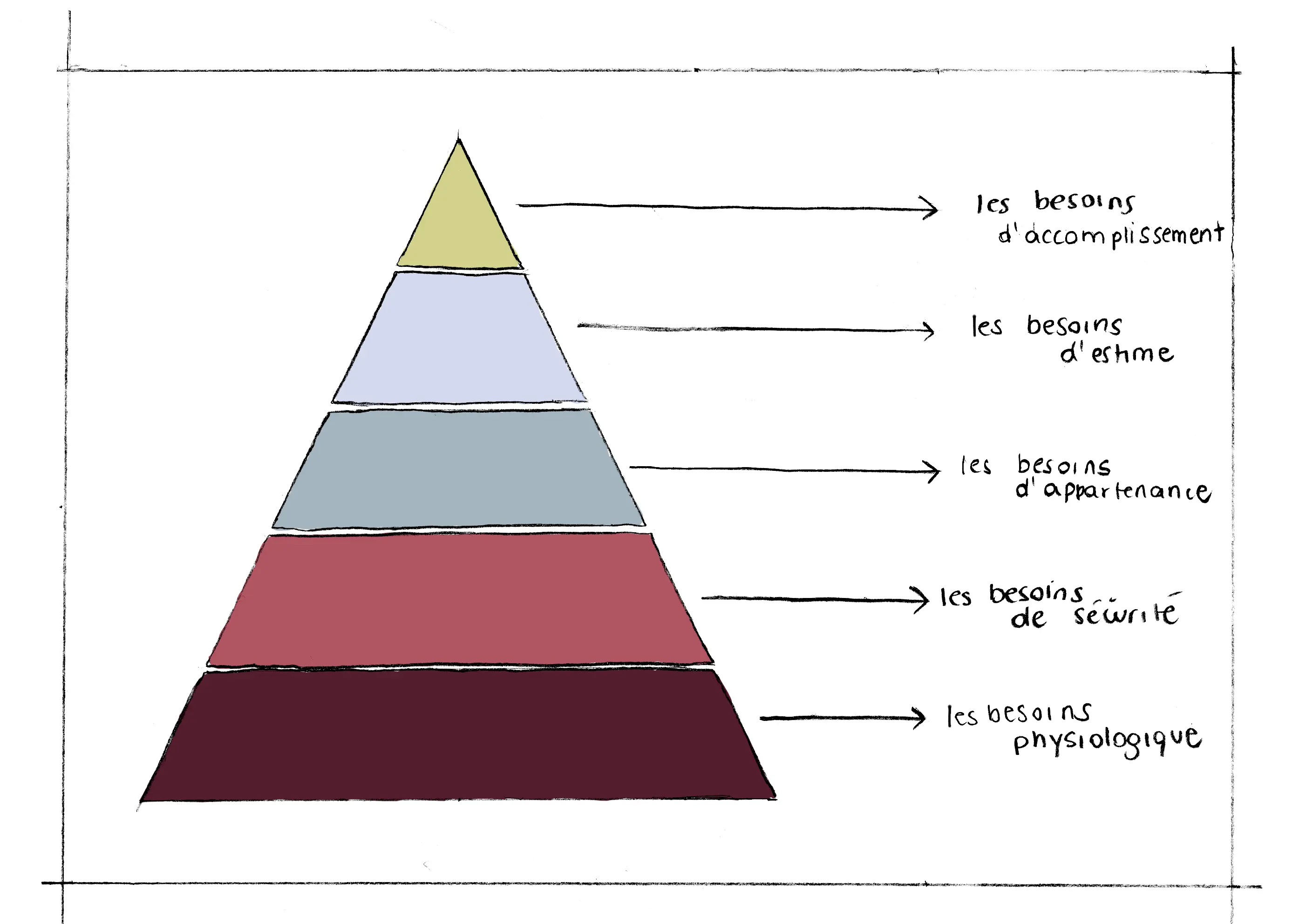 Suivi par le besoin d’appartenance, plus précisément par l’amitié ou la famille, le besoin d’estime. Enfin, on retrouve le besoin d’accomplissement, où l’individu est libre de ses capacités de création, lui procurant un sentiment de pouvoir réaliser ce qu’il souhaite.